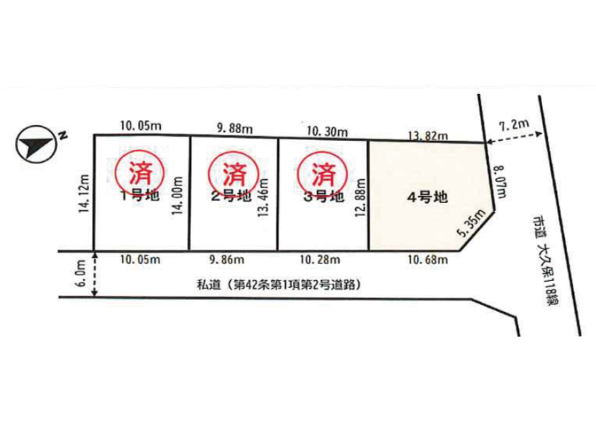 道路幅:6m~7.2m、アスファルト舗装、公道 北側 幅員(約7.2m) 私道 東側 幅員(約6m)